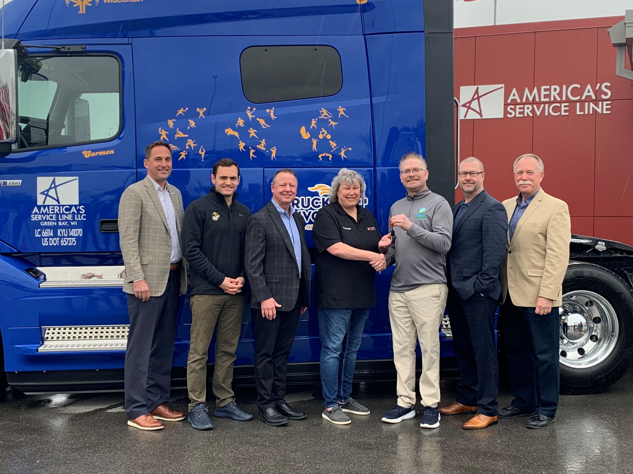 At America’s Service Line (ASL) in Green Bay, Wisconsin on May 3,2022, driver Carmen Anderson received the keys to a new Volvo Semi with Special Olympics wraps. Anderson has driven for 21 years and driven more than 2 million miles accident free. She was named a Women In Trucking’s Top Women to Watch in Transportation in 2021.In 2019, Anderson became the first female to be named the Truck Driver of the Year by the Wisconsin Motor Carriers Association (WMCA). She has actively promoted the Special Olympics as well as Truckers Against Trafficking and the Trucker Buddy program.