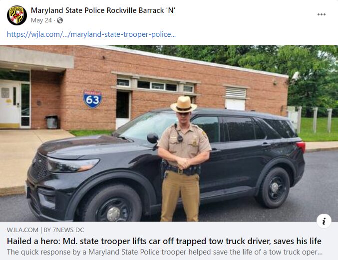 Maryland Governor Larry Hogan stated, “I want to thank Maryland State Trooper Jason Reid for his quick and heroic actions to save a tow truck driver who was trapped underneath an SUV in Silver Spring. Whether on or off duty, Maryland’s Finest are always ready to run toward danger in order to protect the rest of us.”
