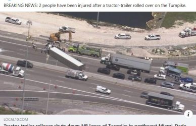 According to WPLG Local 10 News, Two people were injured Wednesday when a tractor-trailer overturned on the Florida Turnpike in Miami-Dade County. All lanes ...