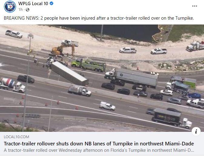 According to WPLG Local 10 News, Two people were injured Wednesday when a tractor-trailer overturned on the Florida Turnpike in Miami-Dade County. All lanes were shut down. According to Miami-Dade Fire Rescue, the injured were transported to a local hospital.